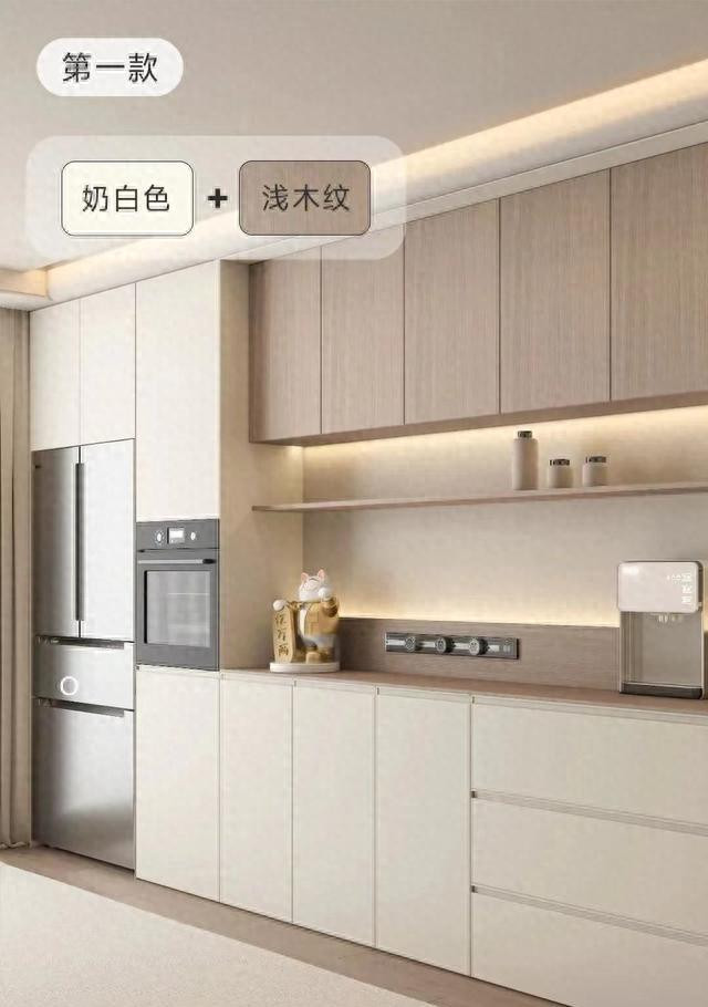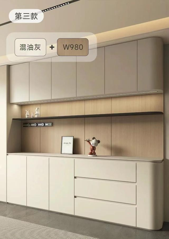 奶白+浅木纹=温煦滤镜不是死白!选带0.5%米调的奶白,配仿白橡木纹,灯带一开像给客厅磨皮。最近流行把木纹转个标的横着贴,显宽两米不是梦。预算紧?用国产PET膜贴柜门,二百多一平米,纹理能骗过90%的邻居。