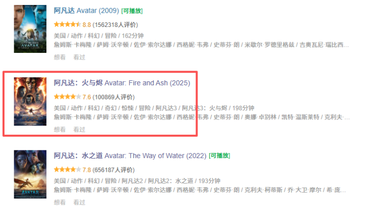 不仅如斯,《阿凡达3》在豆瓣开分7.6,也创下了通盘这个词系列的最低。