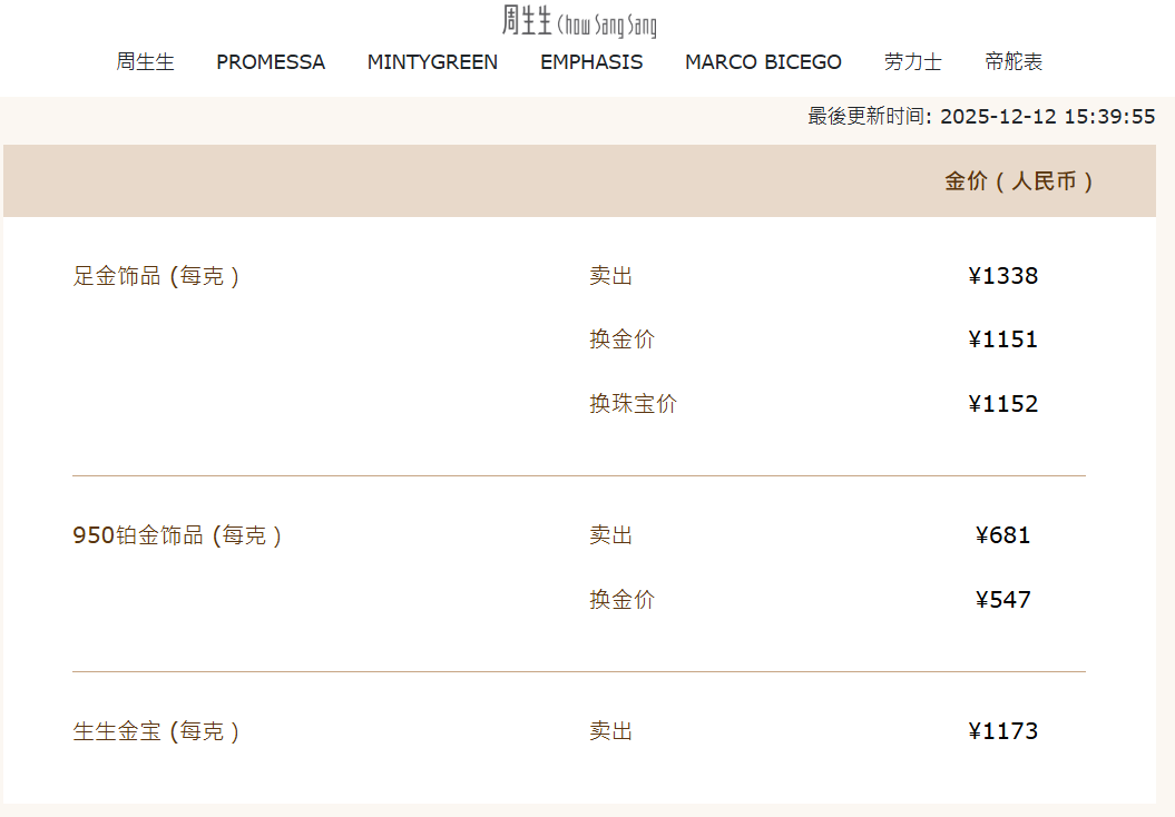 中新经纬查询发现,受此影响,12日,周生生、老庙黄金、老凤祥等国里面分品牌金饰克价也创年内新高。适度发稿,周生生金饰涨至1338元/克,老庙黄金涨至1339元/克,老凤祥金饰涨至1337元/克。